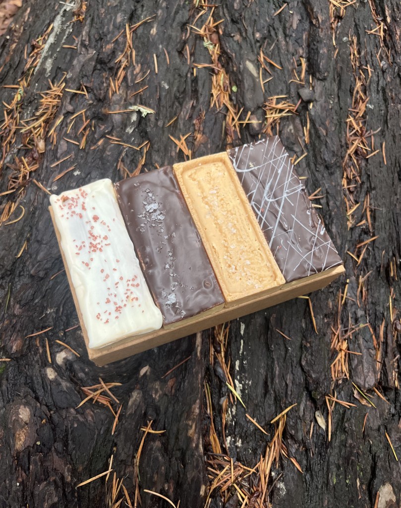 As I admired the rest of their beautiful display (which I sadly forgot to take pictures of), Robert explained how their snacks grew out of a desire to minimize waste: “We started making value-added products with a lot of the byproducts that we had [from] making our fruit butters and brown butters, so we don’t waste [anything]. We put a lot of things that we strain out into our snack mix.” The flavors rotate but have previously included Irish Cream, Ube & Pandan, and Nacho Cheese. Kristi pointed out that “the extra fruit butters we have we incorporate into other products,” like the delicious set of caramel shortbread bars pictured below.