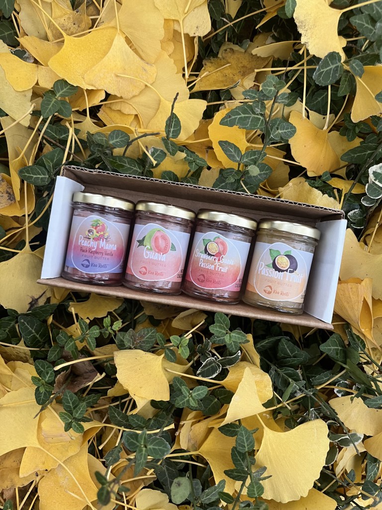 The fruit butter gift pack I picked up from the market featured four flavors: Guava, Passion Fruit, Peachy Mama, and Strawberry Guava Passion Fruit. The latter, Kristi revealed, was “made for our wedding. We actually did that as a launch because he loves guava, I love passionfruit, and we wanted to incorporate Oregon into it, so we decided on Oregon strawberries.” As for the Peachy Mama, she explained, “The two farms that we get the peaches from, [Peachwood Orchard in Hood River, Oregon and Pheasant’s Eye Farm in Parkdale, Oregon] are BIPOC, family-owned farms.” The butter also contains raspberries from the Willamette Valley (Oregon’s wine country) and vanilla pods from the Laie Vanilla Company on Oahu, Hawaii, which the couple uses to make their own vanilla sugar. Kristi noted that the Peachy Mama “takes about a year for us to make, which is why we only bring it for the holidays.”