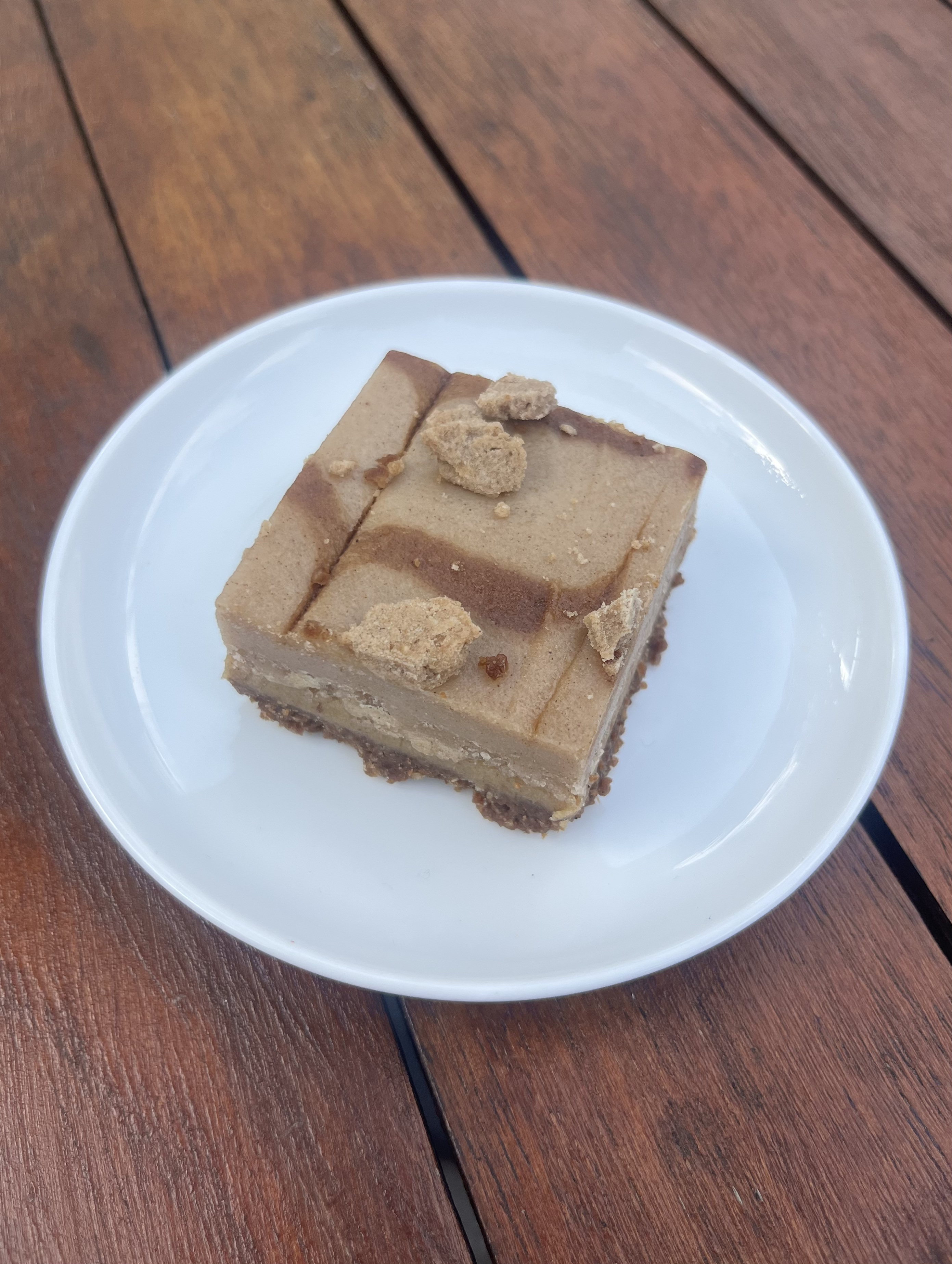 The Dessert: The Stroopwafel Bite features a crunchy baked stroopwafel base, a soft caramel layer, creamy stroopwafel “cheesecake,” and a topping of homemade stroopwafel cookie crumbles and syrup. It’s a unique twist on the classic stroopwafel: indulgent yet free from the usual butter, refined sugar, milk, and eggs.